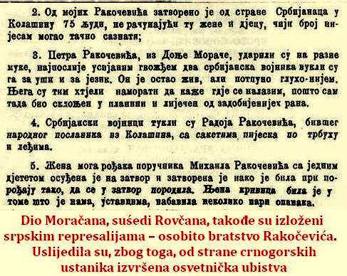 U međuvremenu, dio Moračana, suśedi Rovčana, takođe su izloženi srpskim represalijama – osobito bratstvo Rakočevića. Zbog toga, uslijedila su, na početku jeseni 1919, pripremljena u Rovcima i od strane crnogorskih ustanika izvršena – osvetnička ubistva ...