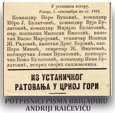 Neki od njih supotpisuju „Pismo ustaničkih vođa komandantu crnogorskih trupa u inostranstvu”, tj. brigadiru Andriji Raičeviću u Gaeti. Napominje se da je pismo, objavljeno i u „Glasu Crnogorca”, nastalo „u ustaškom [ustaničkom] logoru, Rovca, 1. septembra po st[arome] kalendaru 1919”.