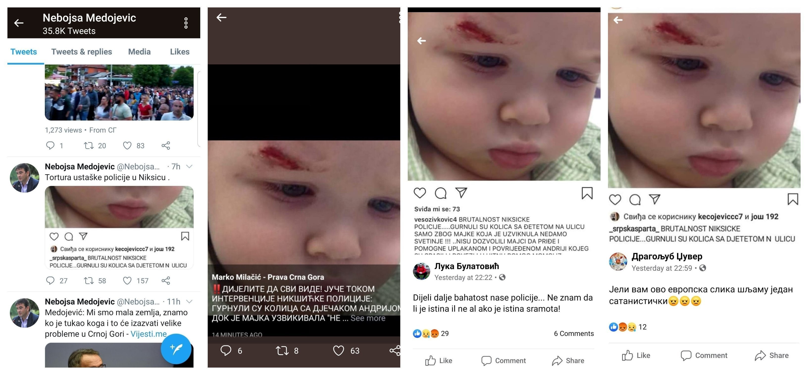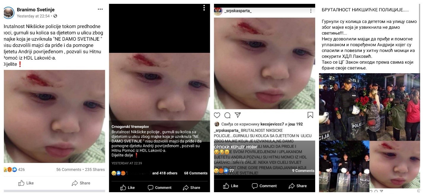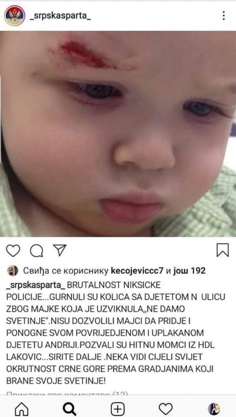 "Brutalnost nikšićke policije, gurnuli su kolica sa djetetom u ulicu zbog majke koja je uzviknula "NE DAMO SVETINJE ", nijesu dozvolili majci da priđe i da pomogne djetetu Andriji povrijeđenom, pozvali su Hitnu Pomoć iz HDL Laković-a. Dijelite dalje".