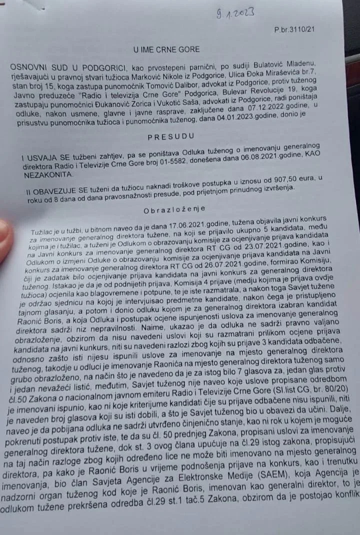 Ovaj sud je, naime, donio presudu kojom se usvaja tužbeni zahtjev i poništava kao nezakonita odluka RTCG o naimenovanju generalnog direktora Javnog servisa Borisa Raonića.