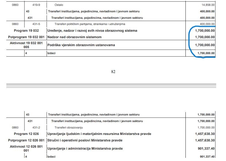 Po stavkama: za finansiranje vjerskih zajednica 1,97 miliona, za finansiranje srednjih vjerskih škola 4,9 miliona a, kako se to kaže, ,,po drugim osnovama“ je utrošeno 1,87 miliona eura.