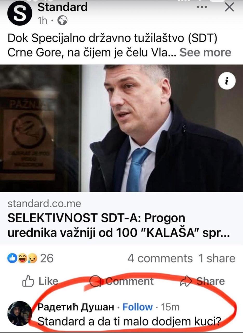 Prijetnja je ispisana danas, kada je na zvaničnoj Facebook stanici portala Standard, ispod linka teksta pod naslovom „Selektivnost SDT-a: Progon urednika važniji od 100 ‘kalaša’ spremanih za Crkvu Srbije“, ispisan komentar korisnika pod imenom Radetić Dušan (ćiriličnim pismom) u kojem je pisalo: „Standard, a da ti malo dođem kući?“