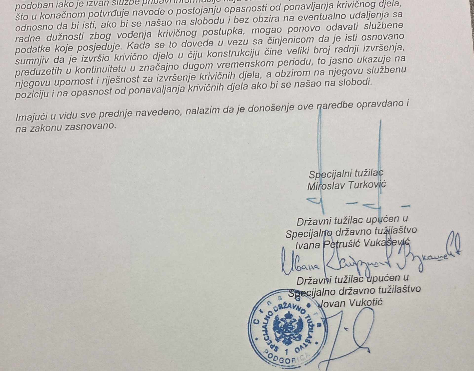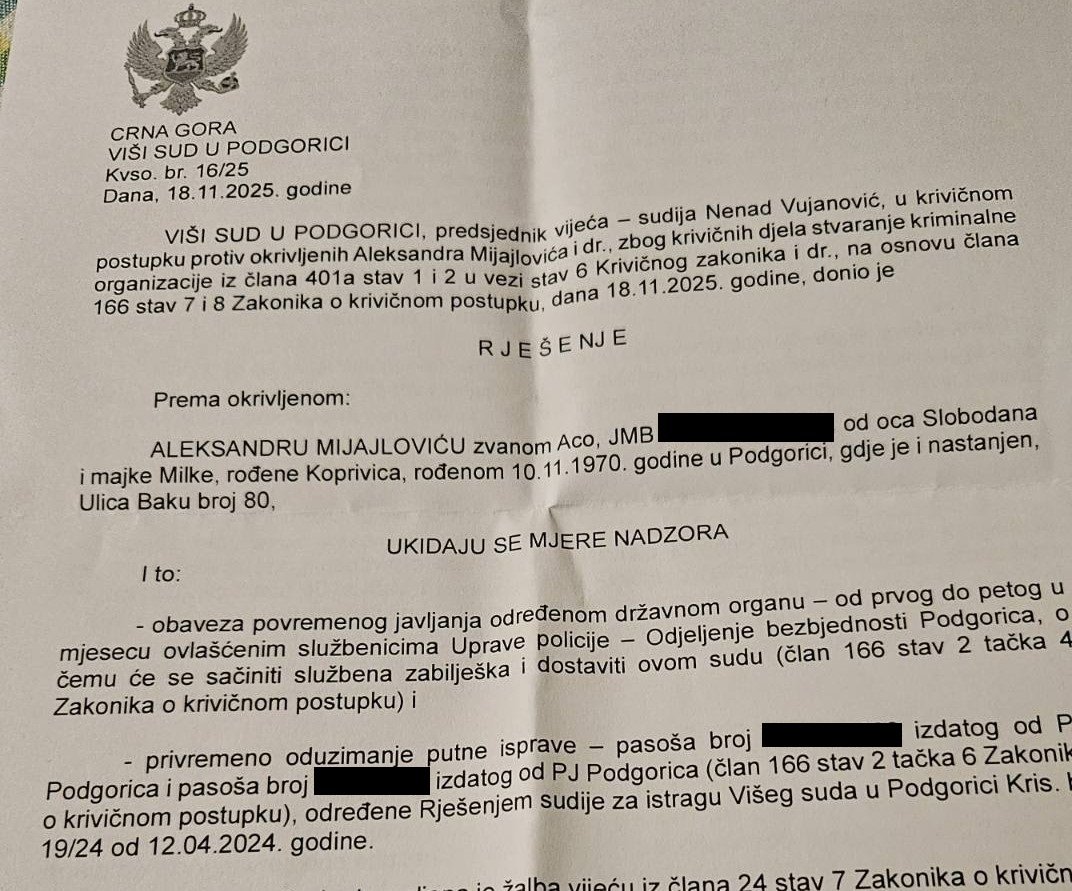 - Ako okrivljenom Aleksandru Mijajloviću u tom predmetu bude ukinut pritvor, tada će se odlučiti da li je i koja od navedenih mjera potrebna, pa se navodi istaknuti u mišljenju Specijalnog državnog tužilaštva da je navedena mjera nadzora, zajedno sa određenim jemstvom, podobna da na kvalitetan način suspenduju opasnost od bjekstva – pokazuju nesonovanim – piše Vujanović u obrazloženju Rješenja.