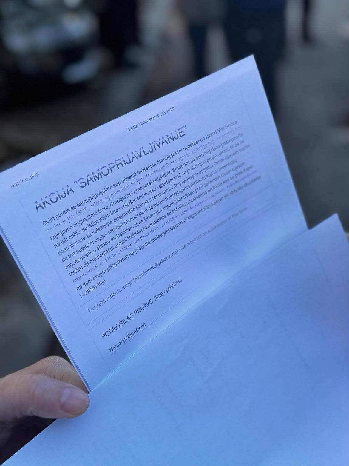 Nakon potpisivanja akcije „samoprijavljivanje“, Pavićević i predstavnik Evropskog saveza Miloš Đuričković uputili su se u zgradu Uprave policije, gdje su predali potpisanu prijavu.
