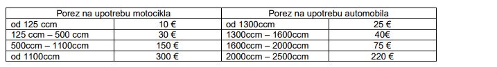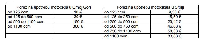 Iz tabele se da zaključiti da je porez na upotrebu motocikala značajno veći kod nas nego u Srbiji, dok ostale zemlje u okruženju nemaju taj porez.