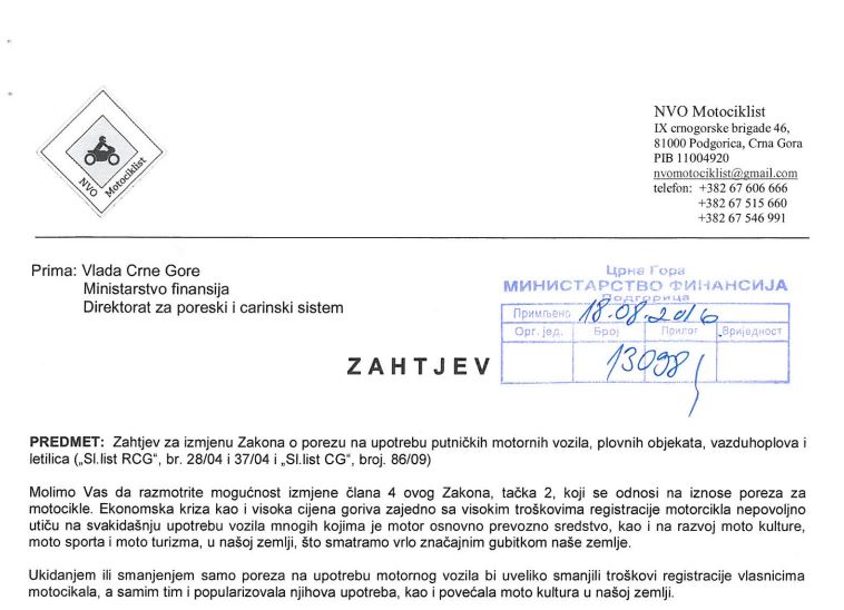 "Na taj način bi se sigurno povećala upotreba motocikala i kao osnovnog sredstva transporta, a samim tim i svega ostalog u vezi sa motociklima. Ako ukidanje poreza na godišnjem nivou donosi našoj zemlji ukupni prihod od oko 80.000 eura, nije moguće, onda tražimo umanjenje prema prijedlogu iz zahtjeva koje smo proslijedili Ministasrtvu finansija".