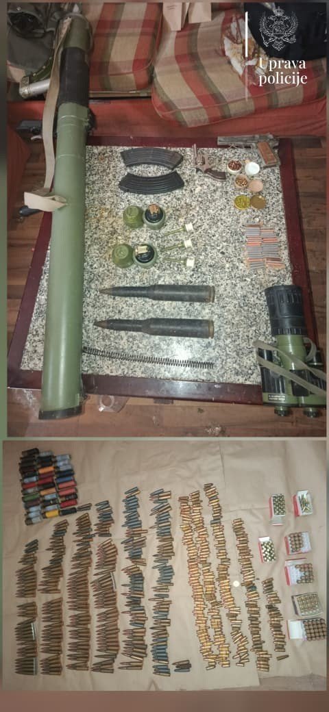 "Policijski službenici su pretresom pronašli i oduzeli: ručni raketni bacač RBR M79, revolver, startni pištolj marke Umarex, dvije ručne bombe M75, 38 komada detonatorskih kapisli, tri vježbovna upaljača, 170 komada lovačkih kapisli, 767 komada municije različite vrste i kalibra, dva okvira od automatske puške, DVR uređaj za snimanje video nadzora, drvenu pušku, dvogled sa termovizijom za noćno osmatranje, pvc kesicu sa sadržajem nepoznate praškaste materije bijele boje i tri mobilna telefona", navode iz Uprave policije.