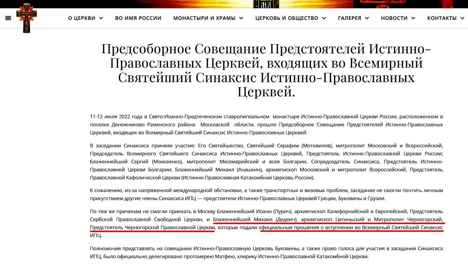 „Iz istih razloga” — navode u saopštenju o skupu predstojateljâ istino-pravoslavnih crkava 11-12. jula 2022. — „nijesu mogli doputovati u Moskvu: njegovo blaženstvo Jovan Purić, arhiepiskop kalifornijski i evropski, predstojatelj Srpske pravoslavne slobodne crkve; i njegovo blaženstvo Mihailo Dedeić, arhiepiskop cetinjski i mitropolit crnogorski, predstojatelj Crnogorske pravoslavne crkve, koji su PODNIJELI ZVANIČNE MOLBE za pristupanje Vaseljenskom Svetom Saboru Istino-pravoslavne crkve”.
