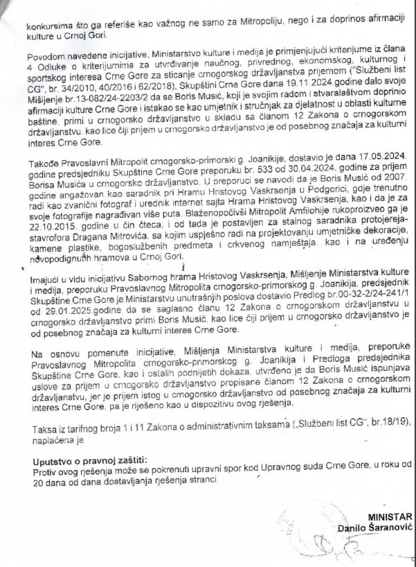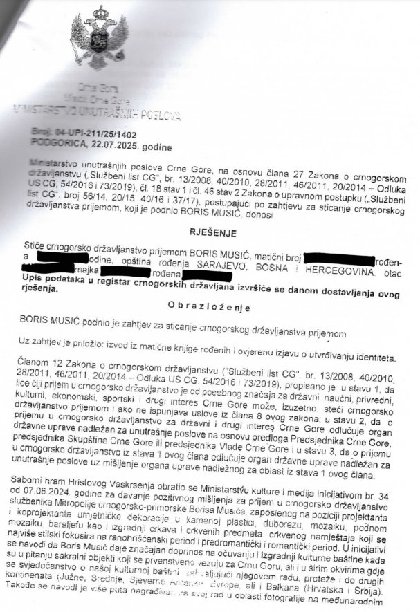 Rješenjem sa zaglavljem Ministarstva unutrašnjih poslova br. 04-UPI-211/25/1402 od 22. jula 2025. crnogorsko je državljanstvo prijemom stekao još jedan stranac, uposlenik eparhije crnogorsko-primorske Crkve Srbije — ovoga puta Boris Musić, rođen u Bosni i Hercegovini.
