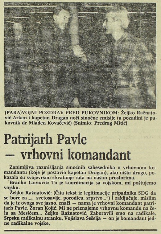 Bilježi se i Ražnatovićev nastup 29. oktobra 1991. u emisiji jedne beogradske TV, široko citian u štampi, kada je pročitao tekst iz SDG legitimacije: da se bore za „svetosavlje, porodicu, srpstvo.”