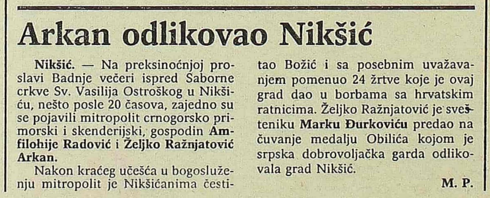 O faktu da Amfilohije — posthumni nosilac ordena Jakova Milatovića — sa Arkanom raspirivaše u našim hramovima antipravoslavnu jeres svetosavlja, skrnaveći i najradosniji hrišćanski dan Roždestva Bogomladenca, evo i izvještaja dopisnika beogradske štampe od 8. januara 1992…