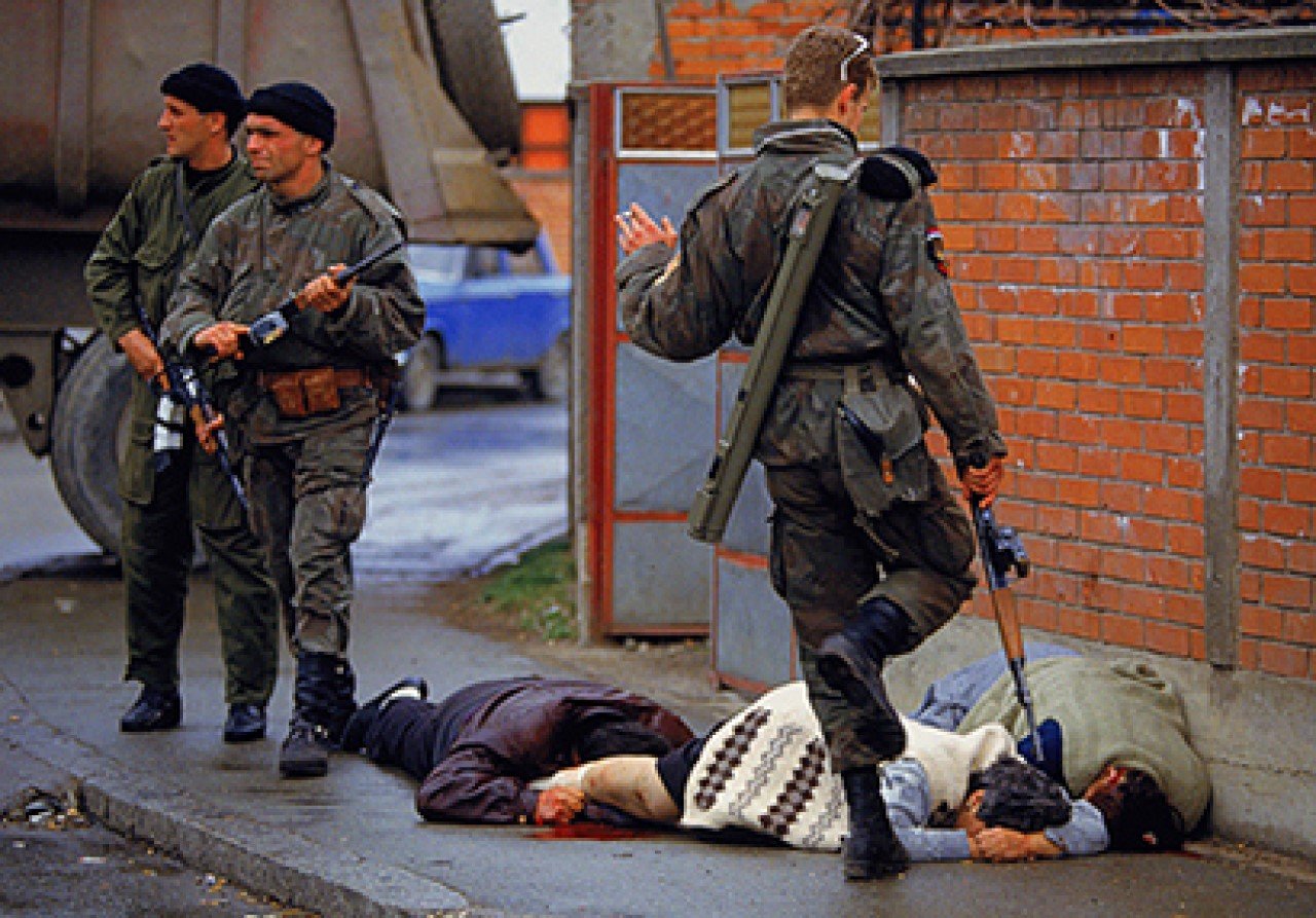 Na Badnji dan 1992, ispred hramova u Cetinju, Titogradu, Nikšiću, „zajedno se pojavili mitropolit Amfilohije Radović i Arkan”. Potom je, 1-2. aprila 1992, Arkan sa svojom bandom prvi izvršio organizovanu oružanu akciju u BiH, kada je napravio masakr nad desetinama muslimanskih civilima u Bijeljini… Foto: Ron Haviv, Wikipedia