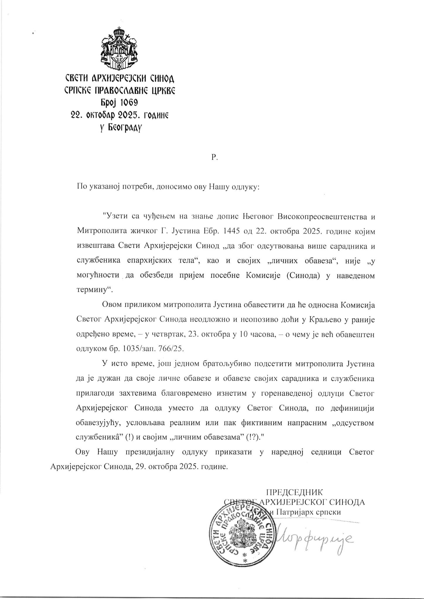Po odluci sinoda Crkve Srbije (SPC) od 10 sati danas u Kraljevu, śedištu eparhije žičke, boravi istražna komisija koja će iskontrolisati materijalno-finansijsko poslovanje i ispitati eparhijskoga mitropolita mitropolita Justina (Miroslava Stefanovića).