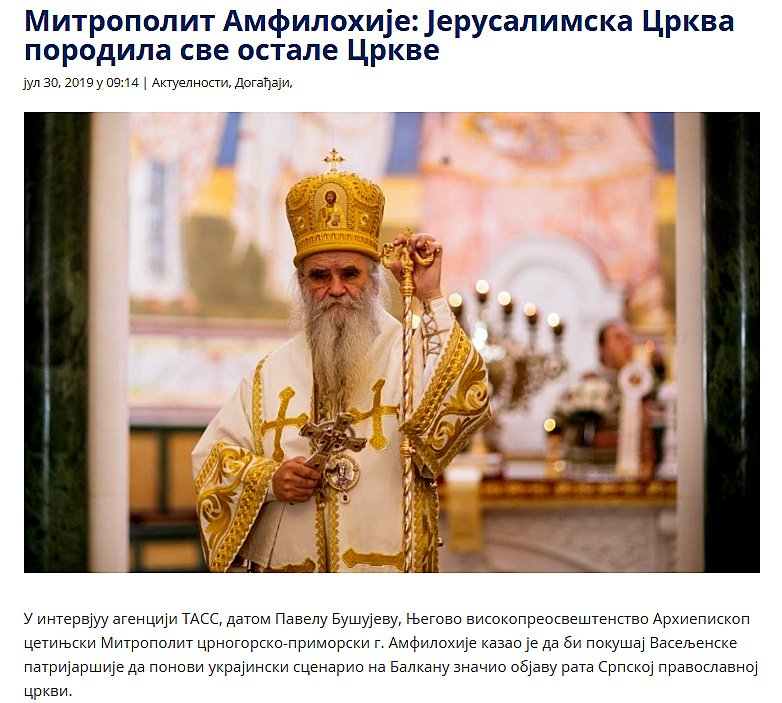 - Amfilohije Radović, koji je oko Crkve u Ukrajine slijedio moskovsku agendu raskola u Istočno-pravoslavnoj Crkvi, osporavanjem ne samo prerogativa Vaseljenske patrijaršije da dodjeljuje nove autokefalije, nego i ukupnog naslijeđa prvoprijestolnosti Majke-Crkve u Carigradu — i prije Irineja Bulovića je za medije govorio o Jerusalimu kao „majci svih crkava”. I to baš za rusku agenciju „ТАСС”!