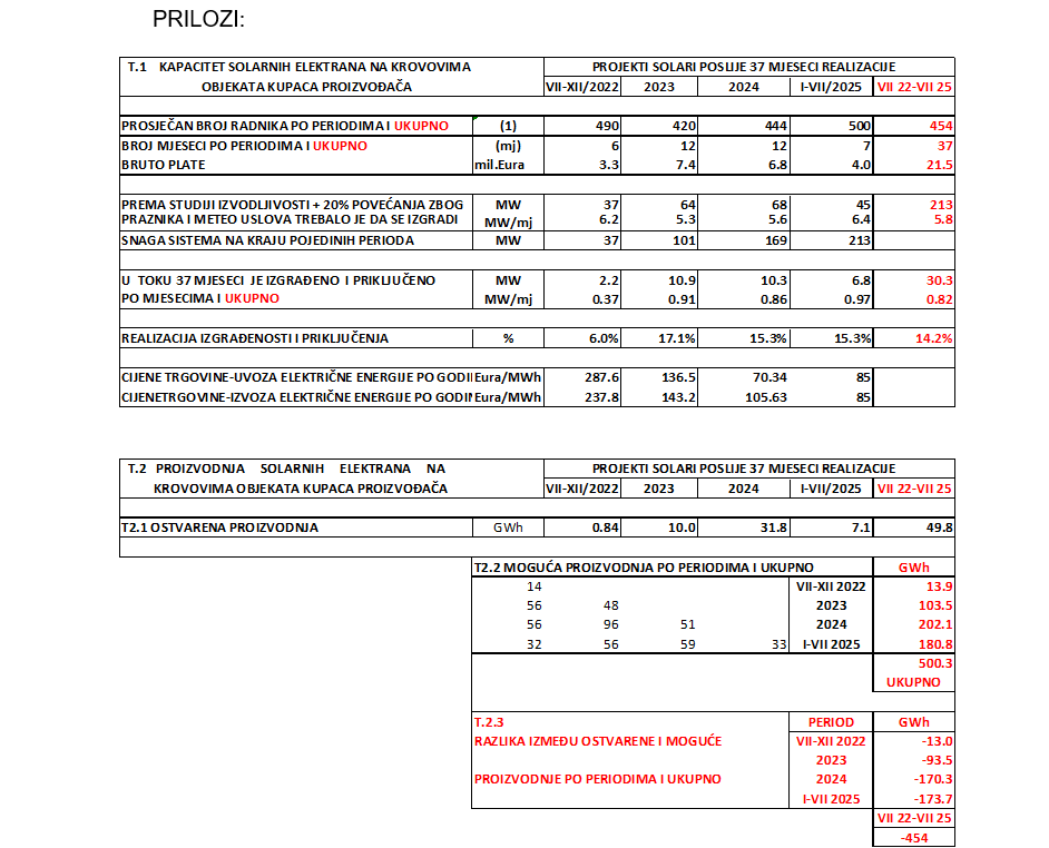 - U EPCG ostvaren je manji prihod zbog neostvarene proizvodnje solarnih elektrana, koja je tu energiju mogla valorizovati prodajom kupcima u Crnoj Gori po 45 Eura /MWh, izvesti po cjeni od 85 do 238 Eur/MWh na druga tržišta ili zamjeniti uvoz po cini 85 do 288 Eur/MWh sa drugih tržišta. Treba imati u vidu činjenicu da se radi o oko 450 GWh električne energije u posmatranom 37-mjesečnom periodu, što je trebalo da olakša poziciju EPCG u periodu višemjesečnog isključenja iz pogona TE Pljevlja u 2025. godini, i preko 300 GWh u narednim godinama.