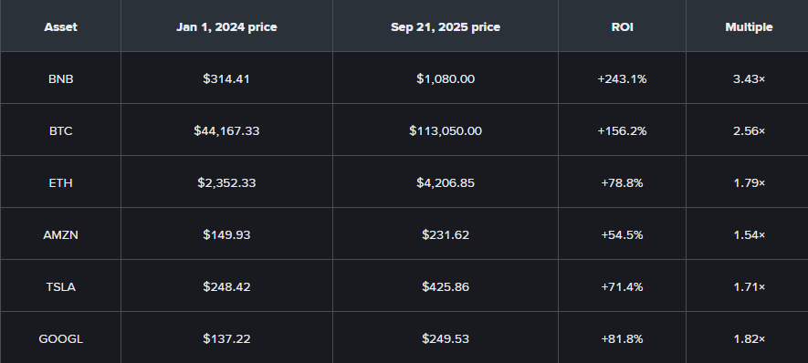 Između januara 2024. i septembra 2025. BNB je ostvario impresivne rezultate u poređenju sa drugim velikim asetima.