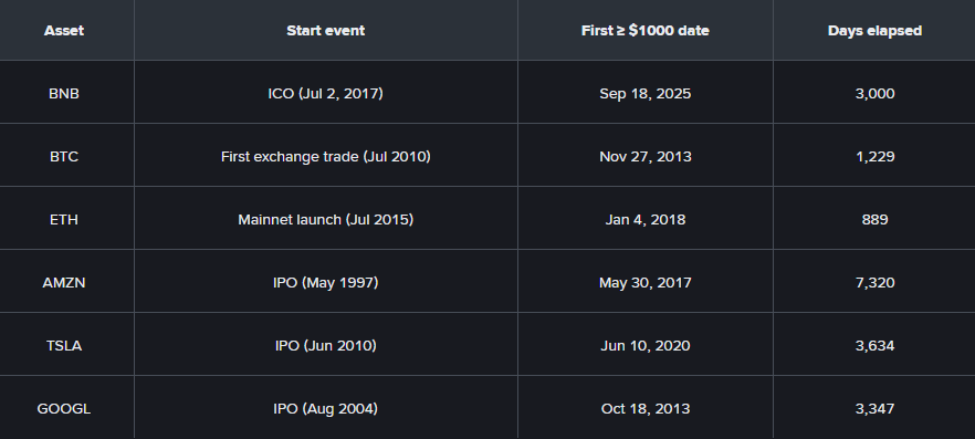 Prelazak granice od 1.000 dolara svrstava BNB među rijetke tokene i akcije koji su dostigli ovaj simbolični nivo. Tek nekolicina kompanija u istoriji – poput Amazona, Googlea, Tesle, Chipotlea i Booking Holdingsa – ikada je dosegla tu vrijednost bez splita akcija, a za većinu je to trajalo decenijama. Za razliku od njih, BNB je tu prekretnicu dostigao za samo 3.000 dana. U svijetu kripta, brži su bili samo Bitcoin i Ether.
