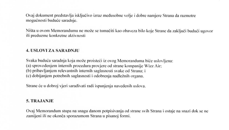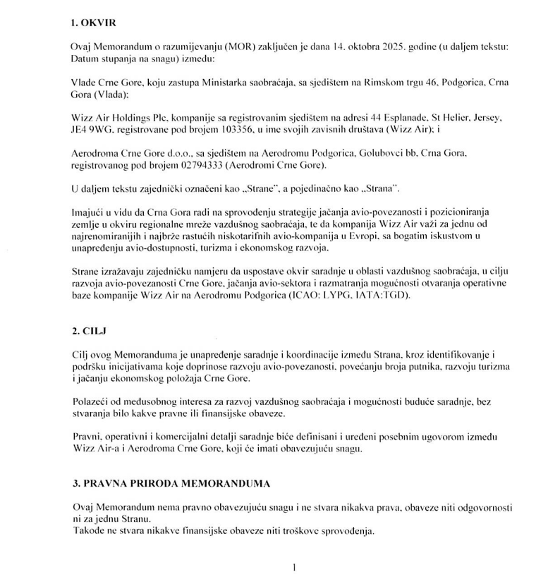 Vlada je juče, 13. oktobra 2025. godine, u skladu s članom 10 Uredbe o Vladi, bez održavanja sjednice, na osnovu pribavljene saglasnosti većine članova Vlade, usvojila Informaciju o zaključivanju Memoranduma o razumijevanju (MOU) između države Crne Gore i avio kompanije Wizz Air Holdings plc s Predlogom memoranduma.