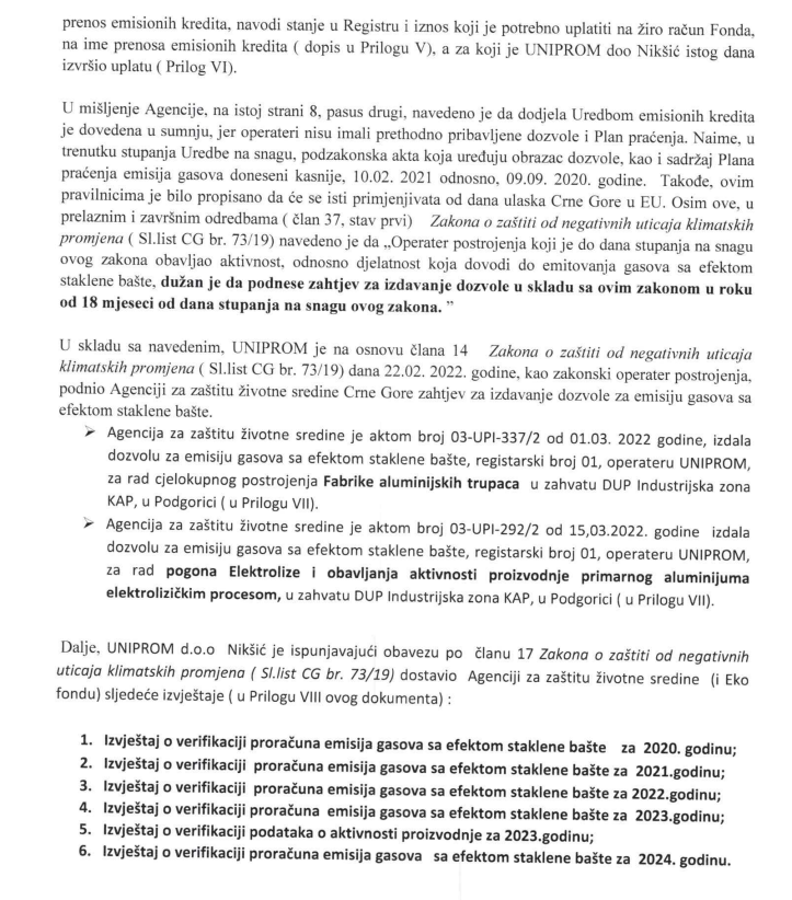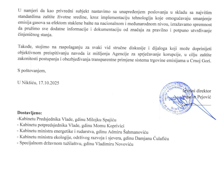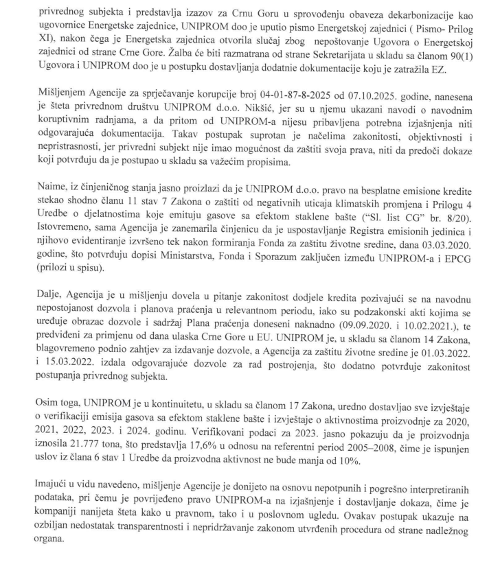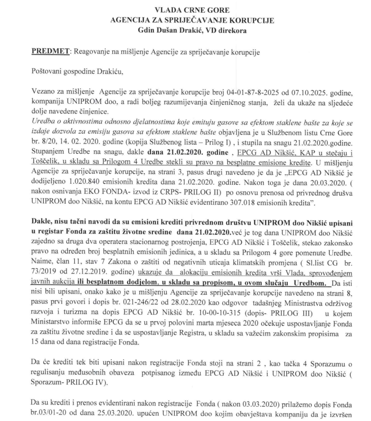 “Povodom odluke Agencije za sprečavanje korupcije kojom je utvrđeno da je u postupku emisije i nabavke CO₂ kredita od strane Elektroprivrede Crne Gore, putem sporazuma sa kompanijom Uniprom, nanesena šteta državnoj kompaniji u iznosu od 17 miliona eura i utvrđeno da je došlo do ugrožavanja javnog interesa koji upućuje na postojanje korupcije, konstatujemo da su nadležni organi objektivno i profesionalno prepoznali i potvrdili postojanje ozbiljnih nepravilnosti koje su pratile ovaj proces, a to je prvi snažan korak u definitivnom razrešenju ovog pitanja”, ističe se u saopštenju Koprivice.