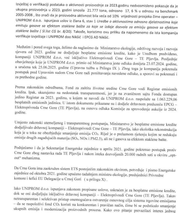 "Nevjerovatno je da u svakom trenutku kada se Uniprom ili neka crnogorska kompanija sprema za veći progresivni korak, nađe se neko iz politike da postavlja prepreke", poručeno je iz kompanije Uniprom nakon saopštenja potpredsjednika Vlade Moma Koprivice u kojem je naveo kako su emisioni krediti bili osmišljeni kao mehanizam bogaćenja, a ne zaštite životne sredine.