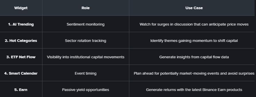 Na tržištu kriptovaluta, brz pristup jasnim i relevantnim podacima može biti ključ uspjeha. Biblioteka widgeta u Binance aplikaciji donosi korisnicima najvažnije uvide – od praćenja promjena u sentimentu na društvenim mrežama, preko trendova po sektorima, do institucionalnih tokova i najavljenih događaja. Sve je jednostavno integrisano i prilagodljivo, što korisnicima omogućava da predvide kretanja na tržištu i optimizuju upravljanje svojim portfoliom.