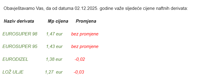 Eurodizel će od ponoći pojeftiniti dva centa, saopšteno je iz Ministarstva energetike i rudarstva.