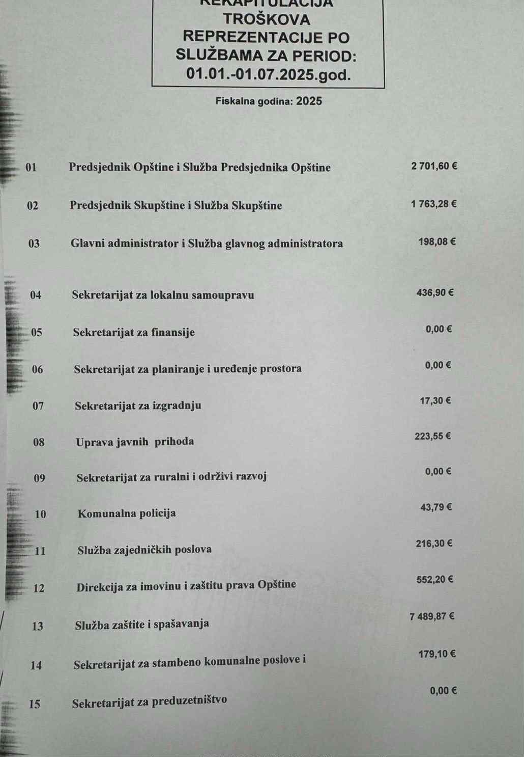 "Prema zvaničnoj rekapitulaciji troškova reprezentacije po službama za period od 1. januara do 1. jula 2025. godine, ukupni troškovi reprezentacije Opštine Bijelo Polje iznose 14.715,27 €, dok troškovi reprezentacije Predsjednika Opštine i njegove službe iznose svega 2.701,60 €. Objavljeni iznos od 14.000 € ne odnosi se na kabinet predsjednika, već na ukupne troškove svih 20 službi, sekretarijata, direkcija i uprava u okviru opštinske administracije — uključujući, između ostalih, Službu zaštite i spašavanja, Sekretarijat za lokalnu samoupravu, Direkciju za imovinu, Sekretarijat za poljoprivredu, Upravu za logistiku i druge organe", navodi se u demantu Opštine Bijelo Polje.