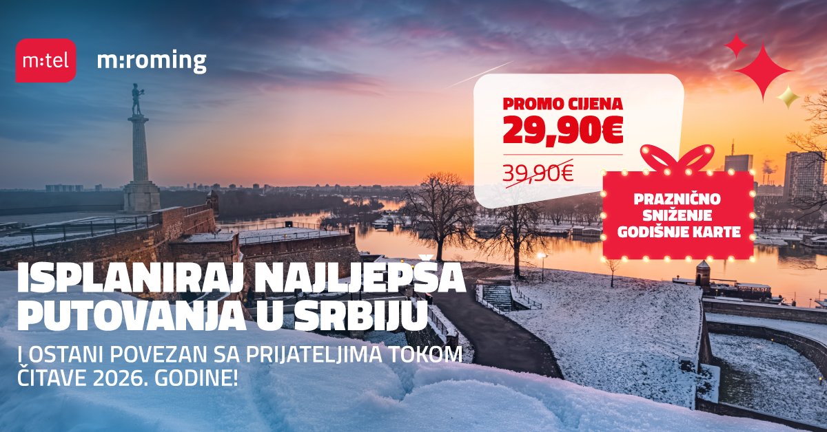 Kako bi svojim korisnicima omogućila neograničenu komunikaciju dok borave u Srbiji, kompanija MTEL je od pripremila specijalno sniženje za godišnji m:roming Prva klasa tiket, koji je u promo periodu od 5.12.2025. do 31.01.2026. godine, dostupan po cijeni od samo 29,9 eura.