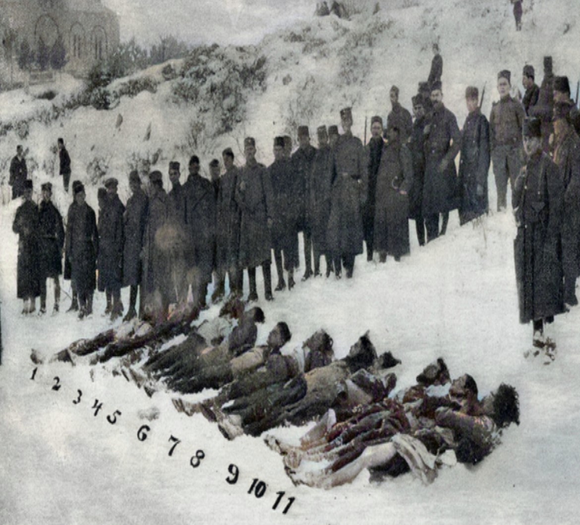 Na gornjoj slici su tijela 11 crnogorskih komita, ubijenih 28. decembra 1923. od strane okupacionih trupa Kraljevine Srba, Hrvata i Slovenaca. U višesatnoj borbi, poginuli su u Šćepan dolu, a sleđene leševe komitâ su potom Srbi dopremili u Nikšić i „izložili” na snijegu blizu Saborne crkve Svetoga Vasilija Ostroškoga.