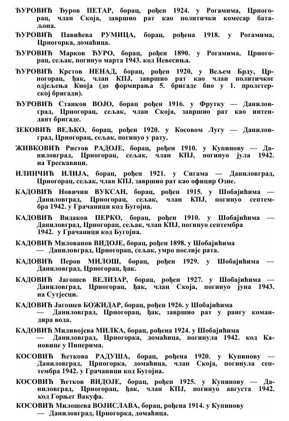 - BOGIĆEVIĆ MIRO, borac, 1916. u Bogićevićima, Crnogorac, završio rat kao komandant bataljona. - ĐURIŠIĆ I. LjUBO, borac, 1912. u Grliću - Danilovgrad, Crnogorac, poginuo 1943. na Krusima. - ĐUROVIĆ ĐOKA, desetar, 1903. u Grliću, Crnogorac, podoficir bivše vojske KJ, poginuo 1942. na Treskavici (BiH). - ĐUROVIĆ TOMO, borac, rođen u Krivačama - Danilovgrad, Crnogorac, poginuo 1943. u istočnoj BiH  kao komandir voda u 8. proleterskoj brigadi. - GRGUROVIĆ J. MILOVAN, komandir voda, 1902. u Glavici - Danilovgrad, Crnogorac, poginuo 1942. kod Glamoča (BiH). - JOVANOVIĆ M. SVETOLIK-MITO, borac, 1924. u Vražegrmcima - Danilovgrad, Crnogorac, poginuo 1944. u Sloveniji kao komandant bataljona. - KALEZIĆ M. MIRKO, borac, 1919. u Kosovu Lugu, Crnogorac, učitelj, završio rat kao rukovodilac politodjela divizije. - KOVAČEVIĆ Radosavov DRAGIŠA, borac, 1919. u Dol. Kovačevića, Crnogorac, poginuo 1943. u borbi na Prozoru (BiH). - KOVAČEVIĆ Radosavova VASILJKA-BULA, borkinja, 1921. u Dol. Kovačevića, Crnogorka, završila rat kao referentkinja batalj. saniteta. - MILATOVIĆ N. BRANKO, borac, 1922. u Dabovićima, Crnogorac, poginuo u Bici na Sutjesci. - PELEVIĆ M. SRETEN, borac, 1920. u Veleti, Crnogorac, završio rat kao komesar brigade. - SEKULIĆ F. DRAGO, borac, 1921. u Sekulićima, Crnogorac, završio rat kao komesar bataljona. - VUČINIĆ P. VASO, 1920. u Kosovu Lugu, Crnogorac, završio rat kao komesar auto-bataljona. - VUJADINOVIĆ B. BOŽO, borac, 1916. u Podvraću, Crnogorac, poginuo 1943. kod Konjica (BiH) kao nišandžija na minobacaču. - VUJOVIĆ R. SPASOJE, borac, 1920. u Orjoj Luci, Crnogorac, poginuo u Bici na Sutjesci.