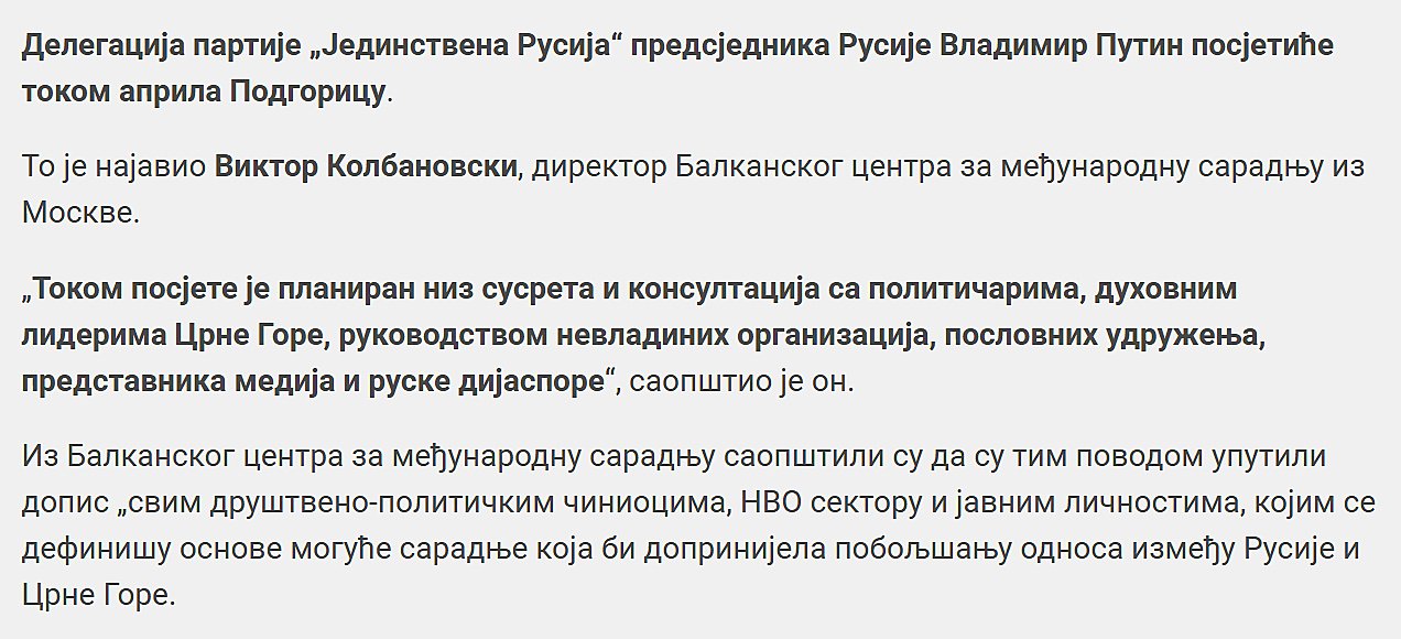Između protesta 2015. i pokušaj državnoga udara (coup) u 2016. godini, članovi stranke Jedinstvena Rusija pośetili su Crnu Goru. Sastali se sa proruskim strankama, vjerskim vođama, nevladinim organizacij. Nakon ovih sastanka u aprilu 2016. tenzije u Crnoj Gori su porasle