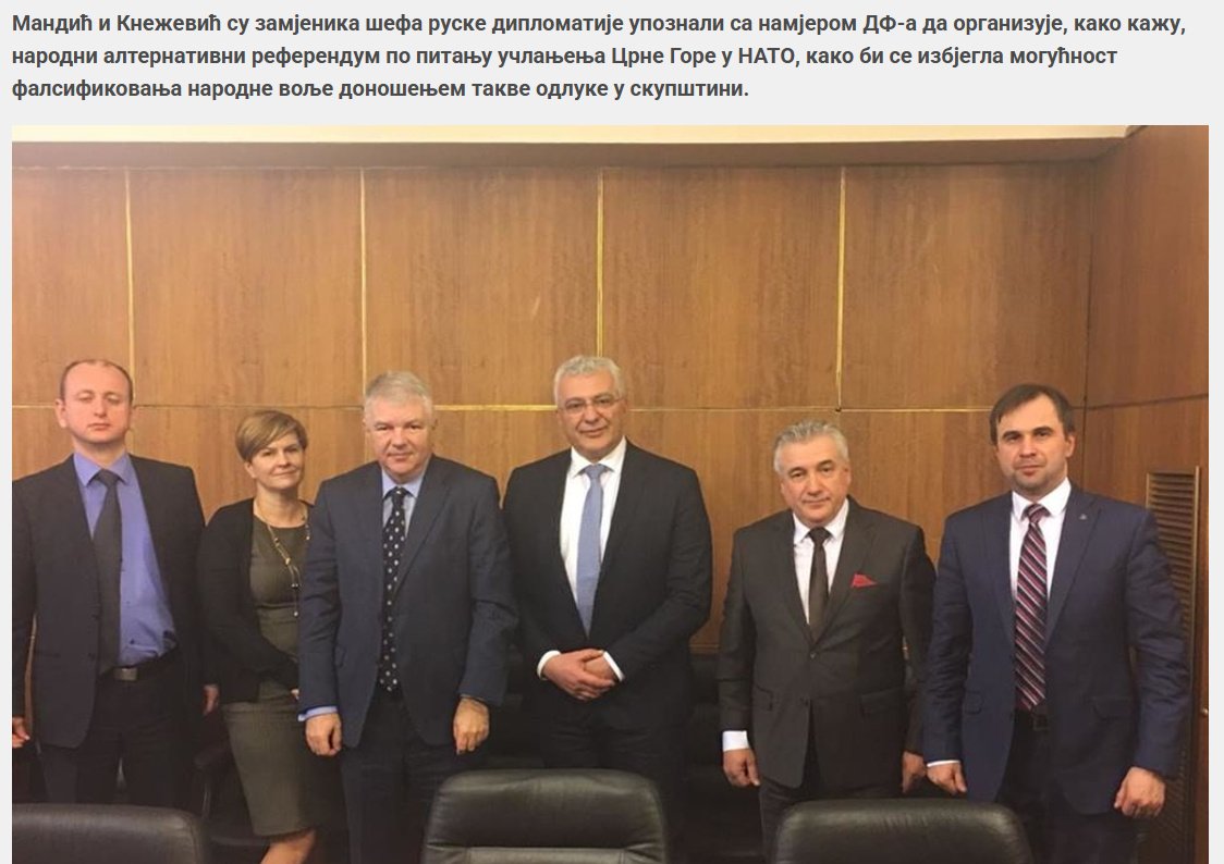 Mnogi lideri DF-a su putovali u Rusiju i sarađivali s Rusijom i imali su njezinu podršku u različitom stepenu. U junu 2016. godine, Mandić, zajedno s Kneževićem i liderima mnogih drugih proruskih stranaka na Balkanu, otputovali su u Rusiju i potpisali sporazum o vojnoj saradnji sa Putinovom Jedinstvenom Rusijom radi „stvaranja vojno neutralne teritorije na Balkanu... (kao dio) smanjenja međunarodnih tenzija radi formiranja teritorije neutralnih suverenih država, koja bi obuhvatala Srbiju, Crnu Goru, Makedoniju i Bosnu i Hercegovinu”.