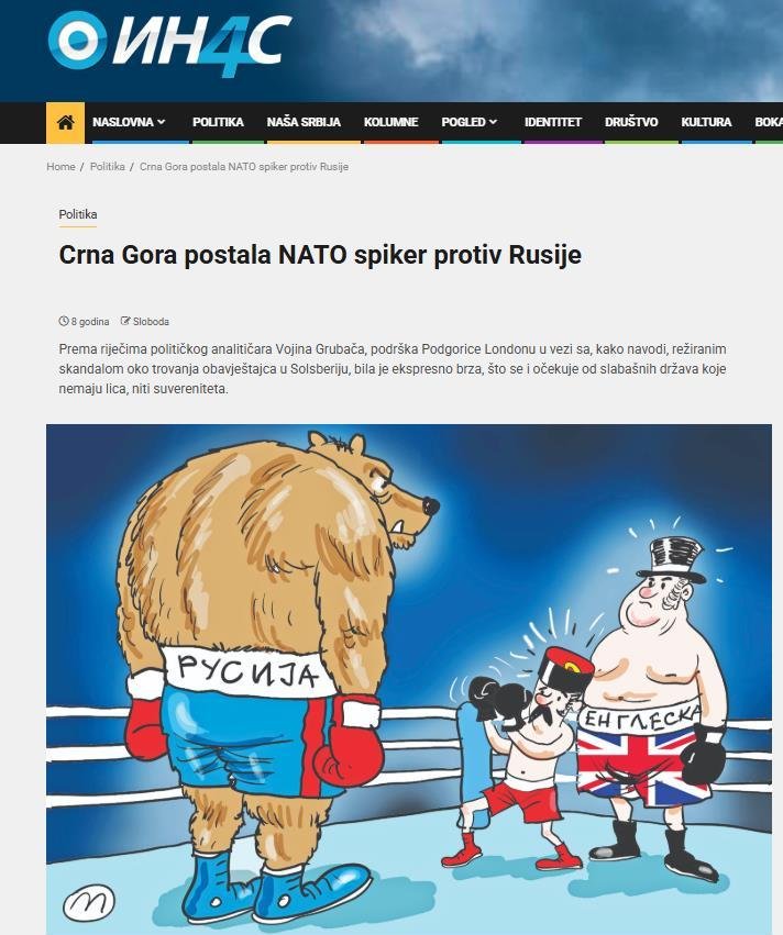 Mediji sa pro-Rusija agendama. - Veb i stranice društvenih medija sa proruskim agendama pokreću se žestoko otkako se Crna Gora pridružila NATO-u. Ovi izvori se često citiraju u mejnstrim medijima u Crnoj Gori, obično bez ikakva upućivanja na originalni izvor informacija, stvarajući efekat talasa proruskih dezinformacija širom zemlje.