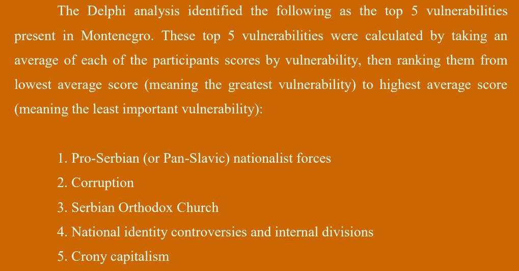Prema rezultatima Delfi analize sprovedene u ovoj tezi, najveće ranjivosti Crne Gore su prosrpske (ili panslovenske) nacionalističke snage, korupcija, SPC, kontroverze oko nacionalnoga identiteta i unutrašnje podjele, i Crony kapitalizam.