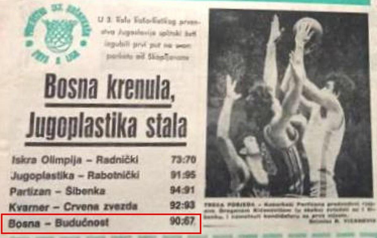Fotka sa utakmice i komentar u srpskoj novini o pobjedi crnogorskoga kluba. Na slici, igrači Budućnosti – tamniji dresovi: Gaci Garić (15), Antić (4), igrača kranje desno ne možemo s pouzdanjem identifikovati