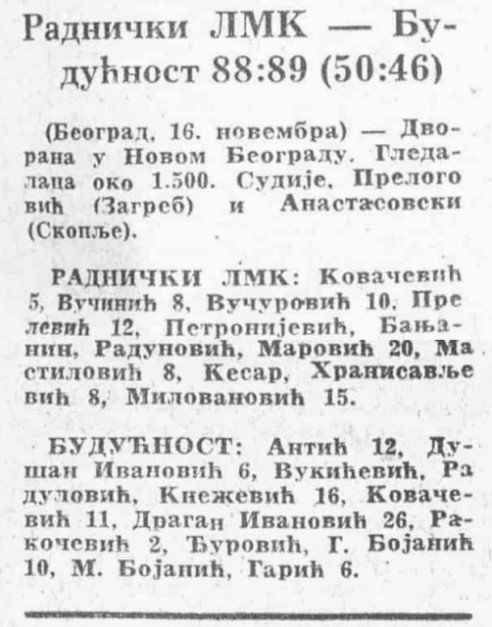 Beograd, 16. novembra. — Dvorana u Novom Beogradu. Gledalaca oko 1.500. Sudije: Prelogović (Zagreb) i Anastasovski (Skoplje). Treneri: Bratislav Đorđević (Radnički LMK), Đurašković (Budućnost).