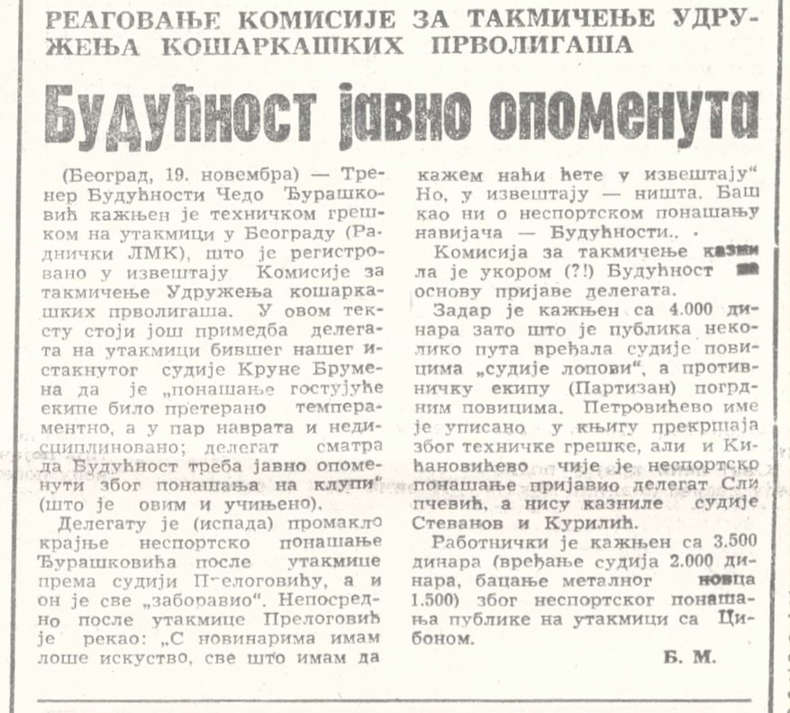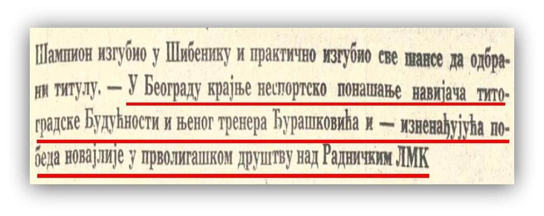 „Ne navodimo ovo da bismo osporili pobjedu Budućnosti” — nastavljaju u istom stilu. — „Ali nam se čini da bi u večerašnjoj atmosferi od Budućnosti mogao da izgubi i mnogo jači tim od Radničkog LMK. Utakmica je odigrana u neregularnim uslovima”.