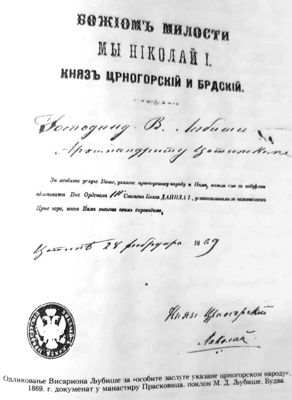 - Častni otče arhimandrite Visarione! Blagovjerni gospodar crnogorski knjaz Nikolaj I. naredbom svojom zapovjeda, a sveti sabor episkopâ blagosilja vašu svetinju, da budete episkop bogospasajemih oblasti Zaholmije i Rasije.
