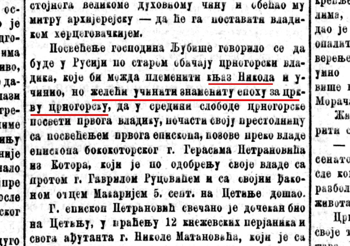 „Posvećenje gospodina Ljubiše govorilo se da bude u Rusiji po starom običaju crnogorski[h] vladika, koji bi možda plemeniti knjaz Nikola učinio, no želeći učiniti znamenitu epohu za CRKVU CRNOGORSKU, da u sredini slobode crnogorske posveti prvoga vladiku, počasti svoju prestolnicu sa posvećenjem prvoga episkopa, pozove preko vlade episkopa bokokotorskog g. Gerasima Petranovića iz Kotora, koji je po odobrenju svoje vlade sa protom g. Gavrilom Rucovićem i sa svojin đakonom otcem Makarijem 5. sept. na Cetinje došao”.