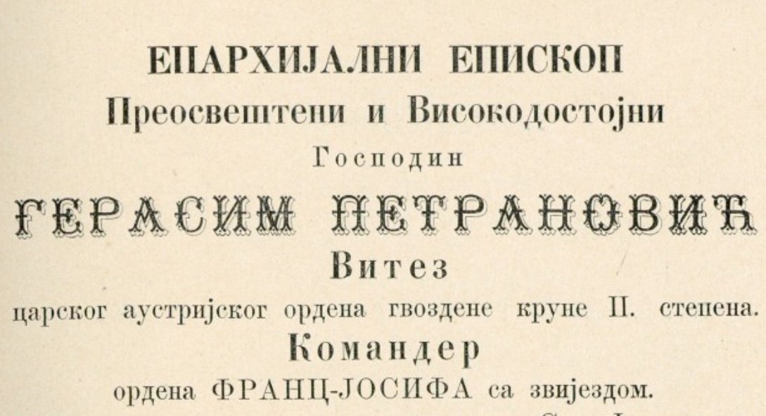 Gerasim Petranović, Srbin rodom iz Šibenika, „vitez crsko-austrijskog ordena gvozdene krune II. stepena” i „komander ordena Franca-Josifa”, tada je episkop eparhije Bokokotorsko-dubrovačke koja je u sastavu još jedne autokefalne jurisdikcije u Austro-Ugarskoj — Bukovinske crkve (Bukovinsko-dalmatinske mitropolije), čiji je poglavar, sa śedištem u Černovicama (moderna Ukrajina) bio Arhiepiskop Černovički i Mitropolit Bukovinsko-Dalmatinski.