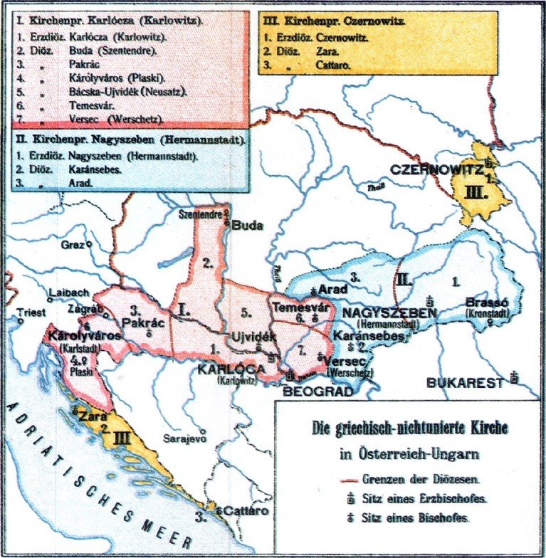 Područje Boke Kotorske, kao i Dalmacija sa tamošnjom istoimenom eparhijom iz Zadra, odlukom austrougarskoga cara, 1873. Izuzima se iz jurisdikcije Karlovačke i pretpotčinjava Bukovinskoj crkvi. Favorizivana od Beča tokom 18. i većim dijelom 19. vijeka, Karlovačka crkva je, iz razloga i netrpeljivosti između pravoslavnih Srba i Rumuna, izgubila ekskluzivnost: od 1864. postojala je u Austro-Ugarskoj još jedna, treća autokefalna jurisdikcija: Sibinjska (Sibinj, nekadašnji Hermanštat, grad u savremenoj Rumuniji), etc.