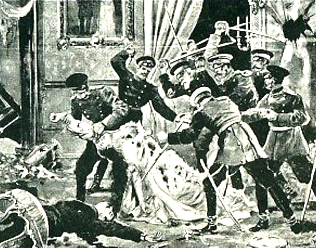 Na ilustraciji: Srbi zaklali njihova kralja i kraljicu, 1903. u Beogradu. „Militantna zavjerenička vojna grupacija, u Srbiji, nametnula se poslije 1903. kao vanparlamentarna i vanustavna politička sila: uticala na izbor poslanikâ, na imenovanje i pad predśednika vlada i ministara, na odlučivanje i skupštine i vladi, na raspuštanje skupštine”