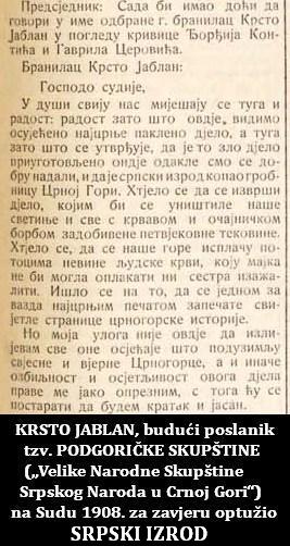 Osobito se interesantnim čini izlaganje koje je uslijedilo: govorio je KRSTO JABLAN, branilac optuženih: cetinjskoga gimnazijalca ĐURA KONTIĆA i bivšega sudije GAVRILA CEROVIĆA. Nota bene, Jablan je 1918. delegat tzv. Podgoričke skupštine!