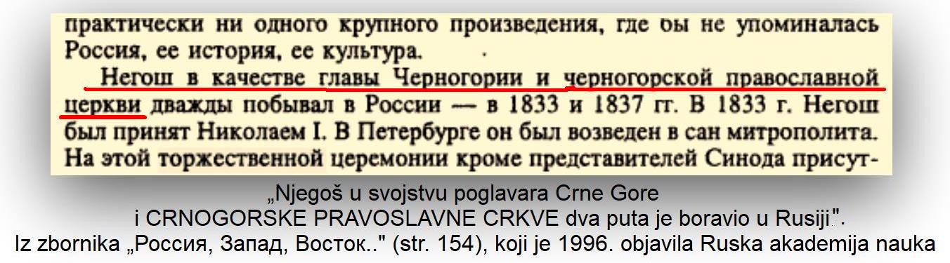Njegoš je, međutim, godine 1918. u tolikoj mjeri veliki Crnogorac, kroz školske sisteme i mas-medije još nedovoljno konfabuliran na anticrnogorskoj osnovi, da ni jedan diskutant tzv. Podgoričke skupštine, ne samo da ga nije mogao citirati u prilog svojoj raboti, nego ga tamo nijesu ni pomenuli.