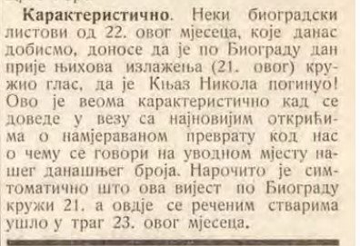 U nastavku teksta objavljeno je kako su neki beogradski listovi još 22. novembra objavili da je“ po Biogradu dan prije njihovog izlaženja (21. ovog) kružio glas da je knjaz Nikola poginuo!