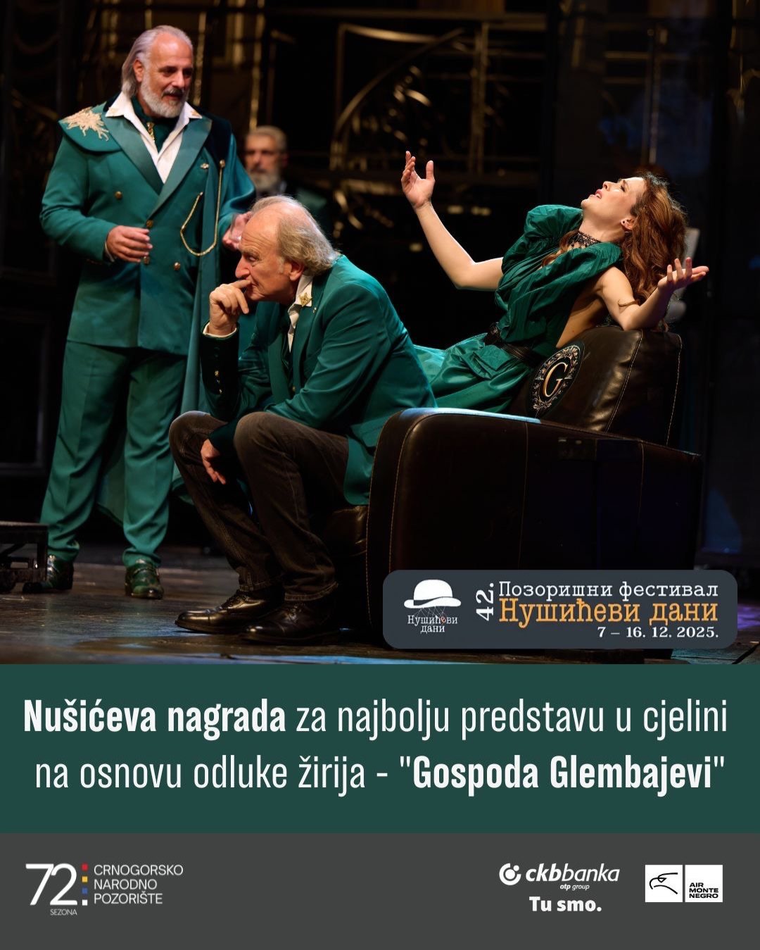 Na Pozorišnom festivalu 42. Nušićevi dani koji se večeras završava u Smederevu, Crnogorsko narodno pozorište s predstavom “Gospoda Glembajevi”, prema tekstu Miroslava Krleže u režiji Danila Marunovića, ostvarilo je izuzetan uspjeh.