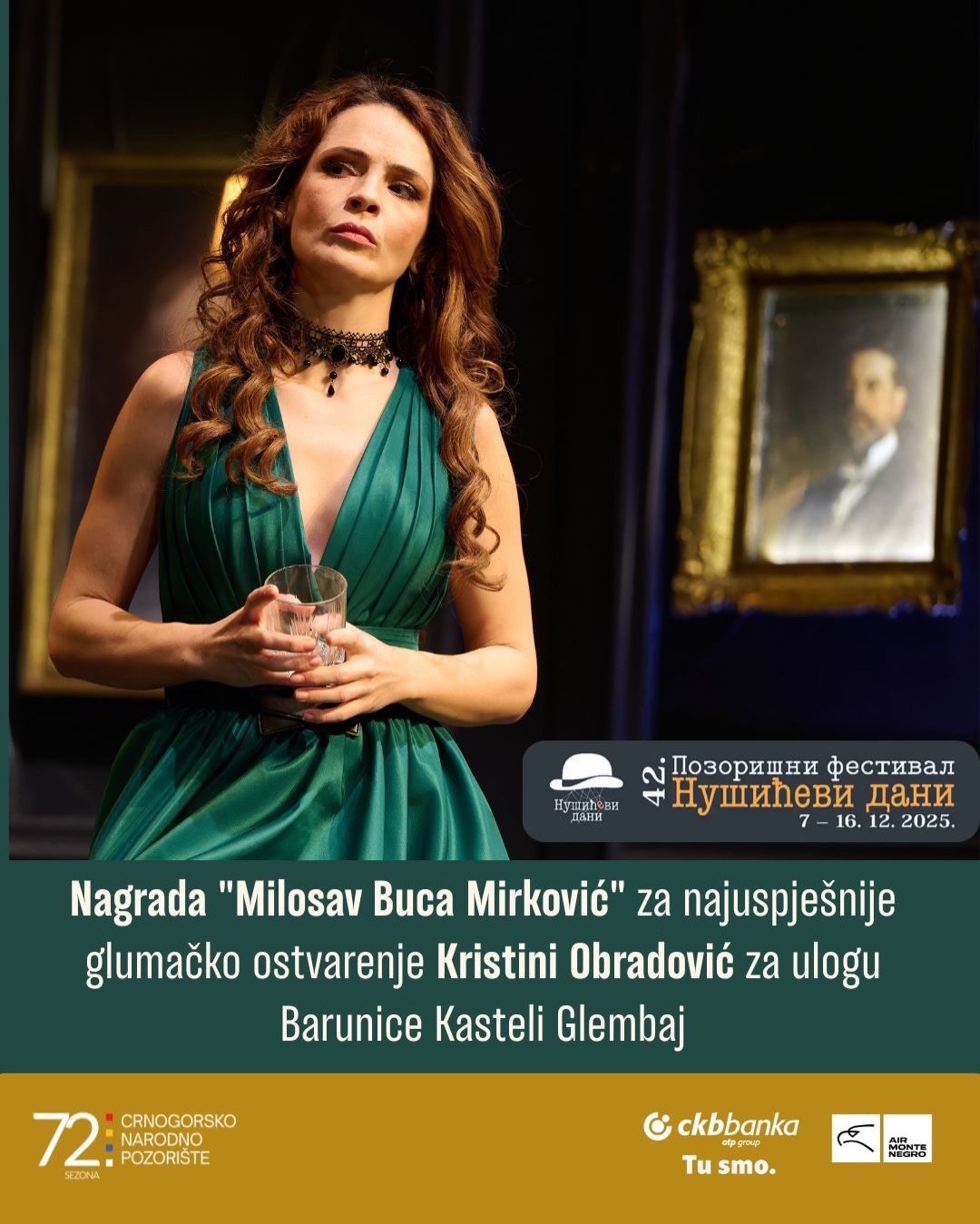 Nagrada “Milosav Buca Mirković” za najuspješnije glumačko ostvarenje pripala je Kristini Obradović za ulogu Barunice Kasteli Glembaj.