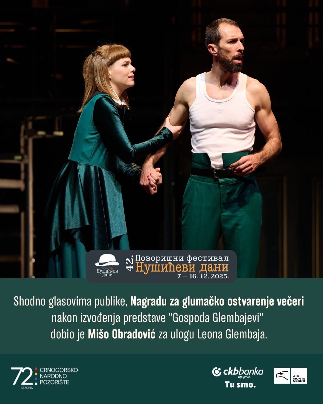 Takođe, shodno glasovima publike, Nagradu za glumačko ostvarenje večeri, nakon izvođenja predstave “Gospoda Glembajevi”, dobio je Mišo Obradović za ulogu Leona Glembaja.