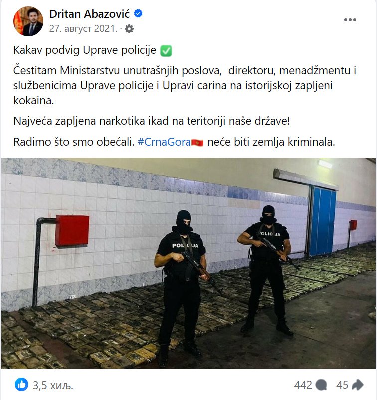 „Čestitam Ministarstvu unutrašnjih poslova, direktoru, menadžmentu i službenicima Uprave policije i Upravi carina na istorijskoj zapljeni kokaina” — saopštava Dritan Abazović na društvenim mrežama 27. avgusta 2021.
