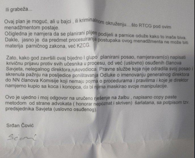 "Regularnim članovima Savjeta i ostacima Pravne službe RTCG,